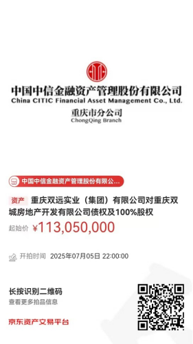 重慶雙遠(yuǎn)實(shí)業(yè)(集團(tuán))有限公司持有重慶雙城房地產(chǎn)開(kāi)發(fā)有限公司債權(quán)和100%股權(quán)。重慶雙遠(yuǎn)實(shí)業(yè)(集團(tuán))有限公司將于2025年7月5日22時(shí)至2025年7月6日22時(shí)在京東拍賣(mài)網(wǎng)通過(guò)公開(kāi)競(jìng)價(jià)方式進(jìn)行處置,拍賣(mài)鏈接如下圖所示,現(xiàn)予以公告。