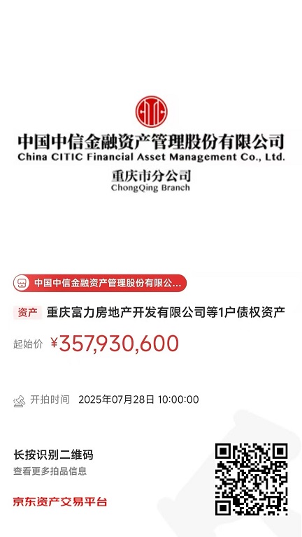 中國中信金融資產(chǎn)管理股份有限公司重慶市分公司(以下簡稱“中信金融資產(chǎn)重慶分公司”)持有的對(duì)重慶富力房地產(chǎn)開發(fā)有限公司等1戶債權(quán)資產(chǎn)定于2025年7月28日10時(shí)至2025年7月29日10時(shí)止(延時(shí)的除外)在京東資產(chǎn)交易平臺(tái)(網(wǎng)址https://zcpm.jd.com/)進(jìn)行公開競(jìng)價(jià)活動(dòng),拍賣鏈接如下圖所示,競(jìng)拍相關(guān)事宜詳見拍賣鏈接里的競(jìng)拍公告及競(jìng)拍須知,現(xiàn)予以公告。